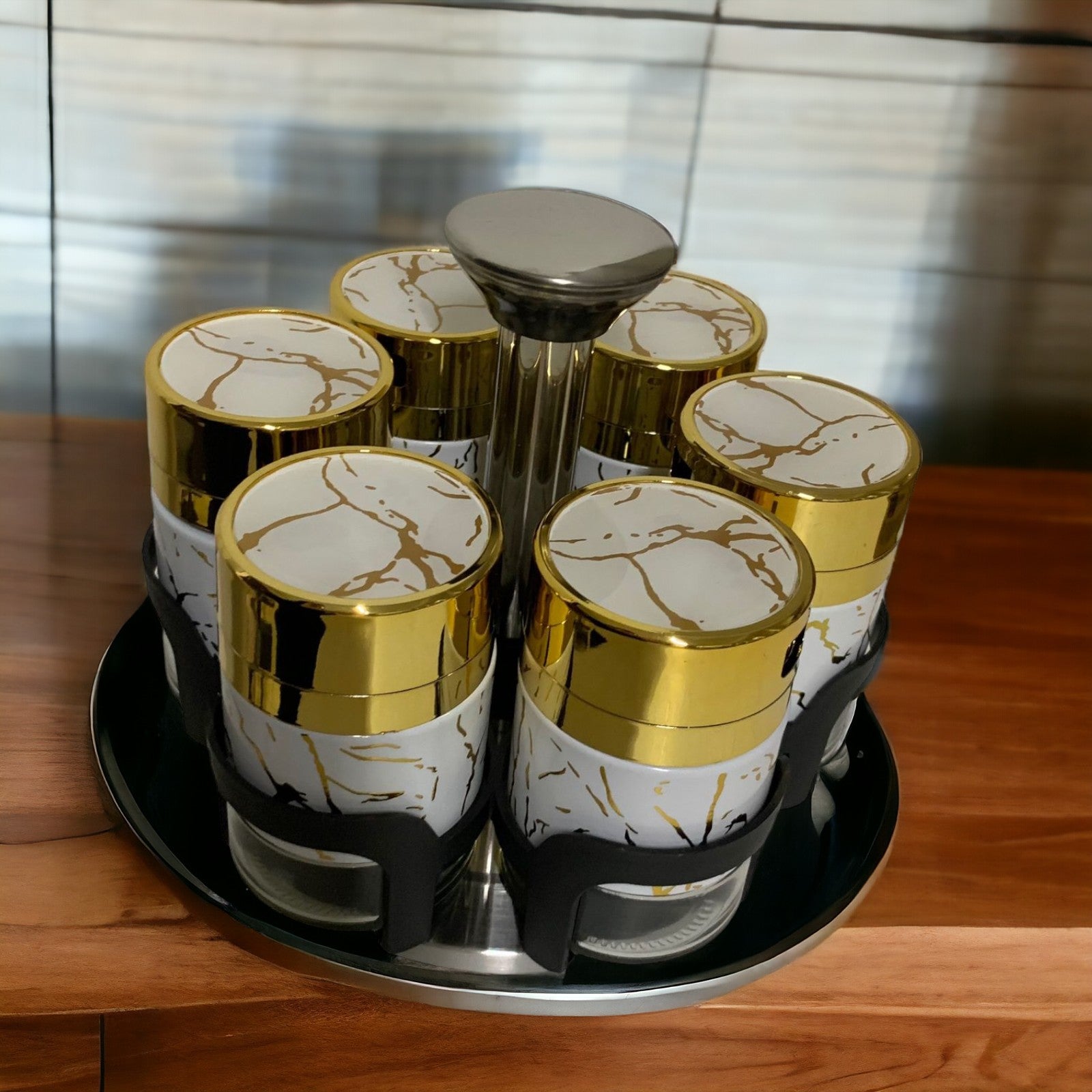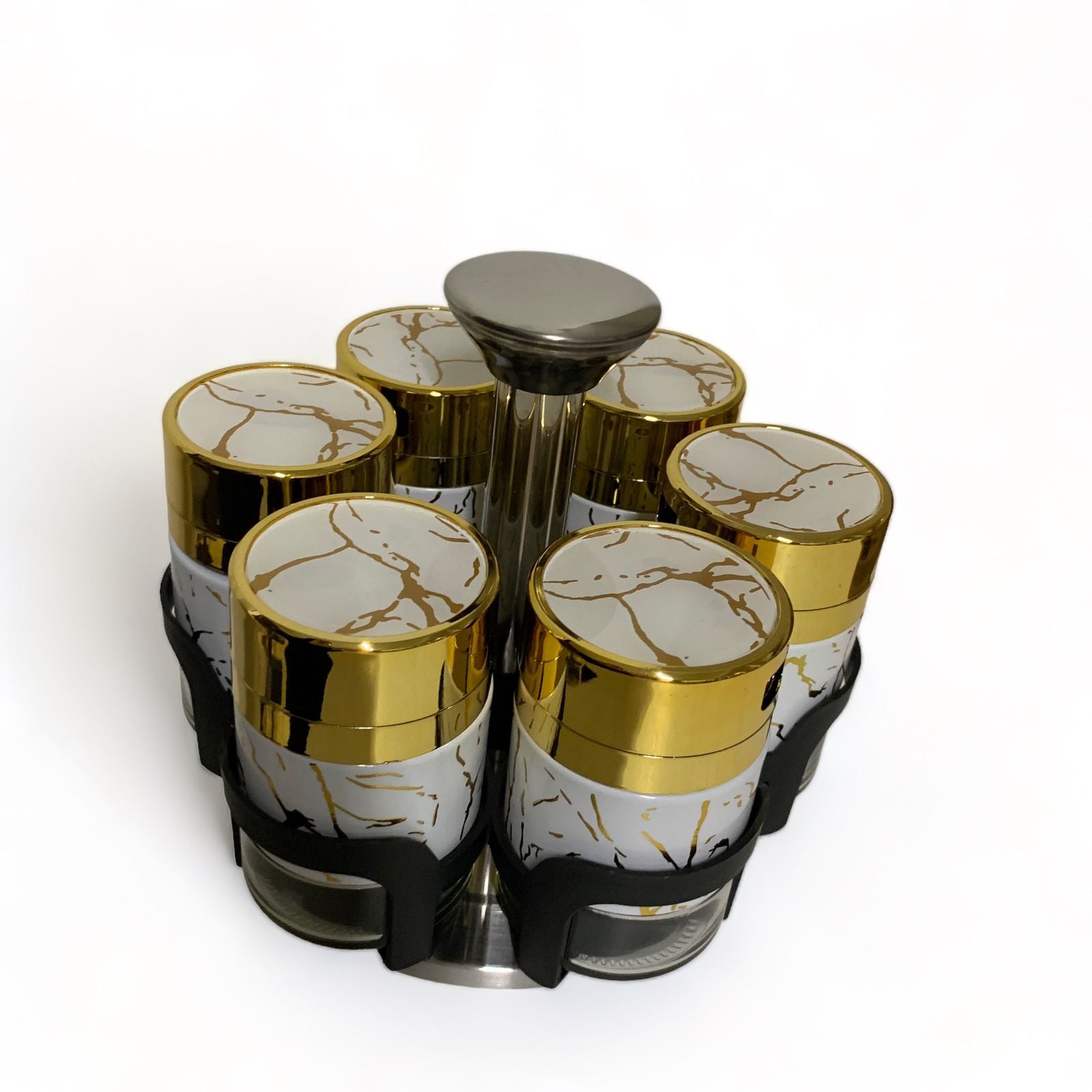 Especiero con 6 frascos de vidrio con tapa de acero inoxidable de color blanco con dorado y base giratoria que permite un movimiento de 360°. Compra de mayoreo y surte tu tienda o negocio, tenemos peluches, perfumes, ventiladores, maquillaje, accesorios, desechables, mochilas, blancos, papelería, juguetes y productos de temporada de mayoreo en demayoreo.com.