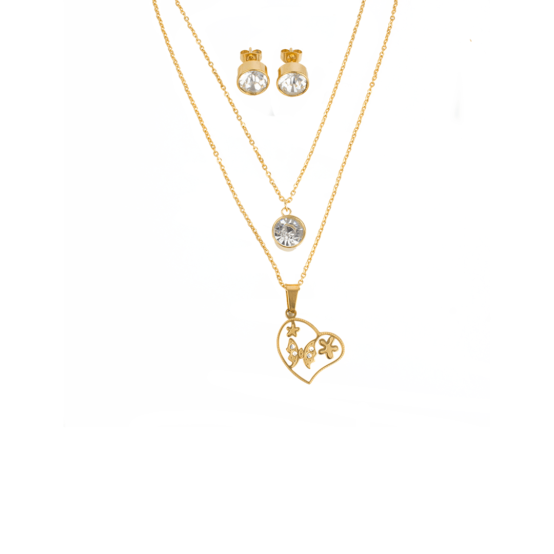 Juego de aretes doble y collar de corazón dorado de acero. Compra de mayoreo y surte tu tienda o negocio, tenemos peluches, perfumes, ventiladores, maquillaje, accesorios, desechables, mochilas, blancos, papelería, juguetes y productos de temporada de mayoreo en demayoreo.com.