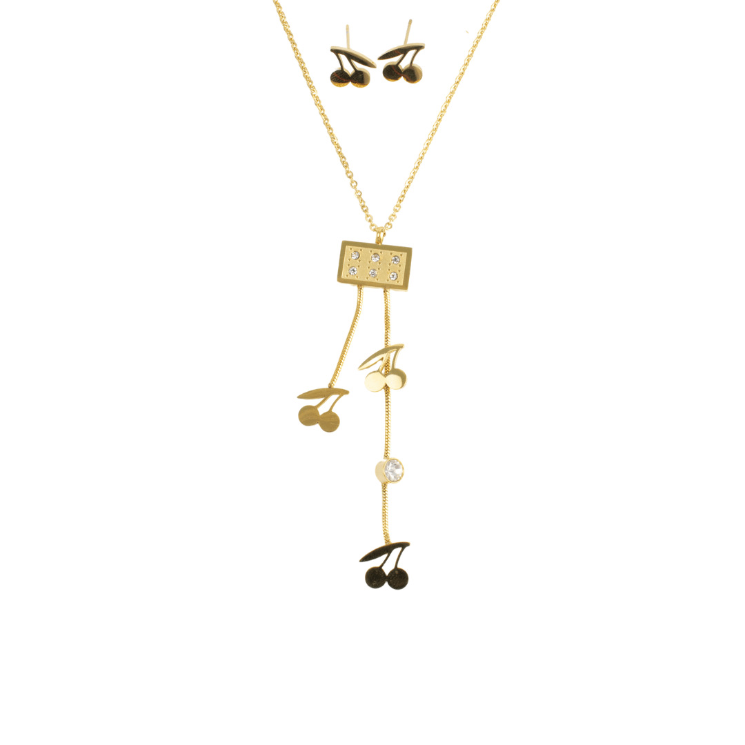 Juego de aretes y collar de cerezas dorado de acero. Compra de mayoreo y surte tu tienda o negocio, tenemos peluches, perfumes, ventiladores, maquillaje, accesorios, desechables, mochilas, blancos, papelería, juguetes y productos de temporada de mayoreo en demayoreo.com.