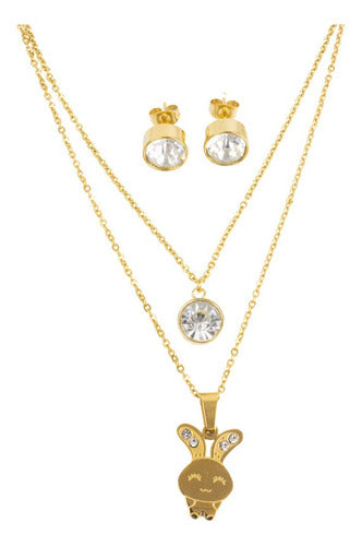 Juego de aretes y collar conejo dorado de acero. Compra de mayoreo y surte tu tienda o negocio, tenemos peluches, perfumes, ventiladores, maquillaje, accesorios, desechables, mochilas, blancos, papelería, juguetes y productos de temporada de mayoreo en demayoreo.com.