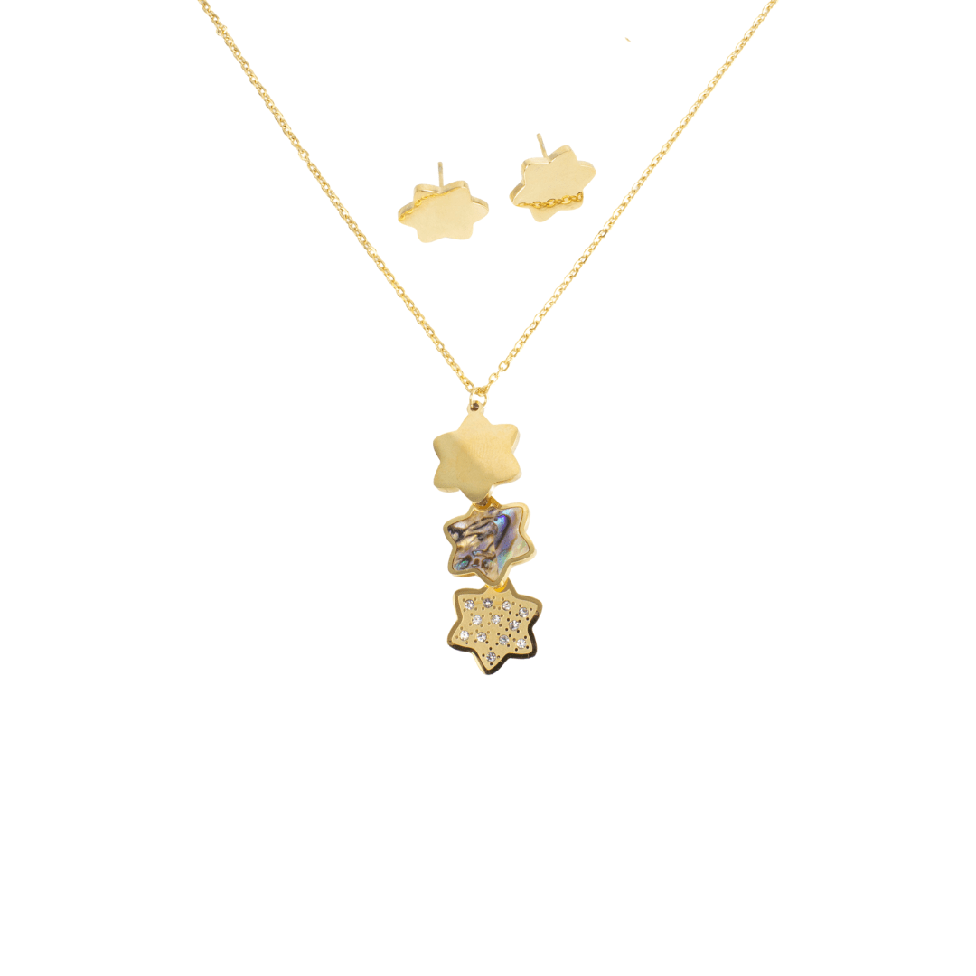 Juego de aretes y collar estrellas dorado de acero. Compra de mayoreo y surte tu tienda o negocio, tenemos peluches, perfumes, ventiladores, maquillaje, accesorios, desechables, mochilas, blancos, papelería, juguetes y productos de temporada de mayoreo en demayoreo.com.