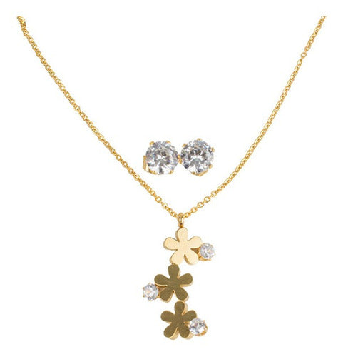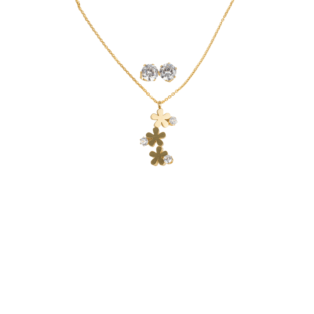 Juego de aretes y collar de flores con piedras dorado acero. Compra de mayoreo y surte tu tienda o negocio, tenemos peluches, perfumes, ventiladores, maquillaje, accesorios, desechables, mochilas, blancos, papelería, juguetes y productos de temporada de mayoreo en demayoreo.com.