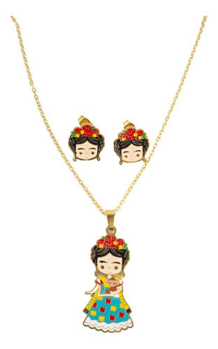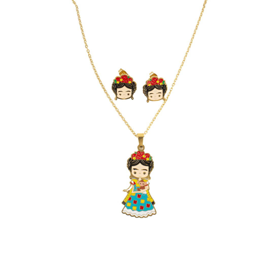 Juego de aretes y collar Frida Kahlo con vestido de acero. Compra de mayoreo y surte tu tienda o negocio, tenemos peluches, perfumes, ventiladores, maquillaje, accesorios, desechables, mochilas, blancos, papelería, juguetes y productos de temporada de mayoreo en demayoreo.com.