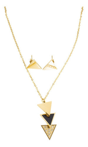 Juego de aretes y collar triángulos dorado de acero. Compra de mayoreo y surte tu tienda o negocio, tenemos peluches, perfumes, ventiladores, maquillaje, accesorios, desechables, mochilas, blancos, papelería, juguetes y productos de temporada de mayoreo en demayoreo.com.