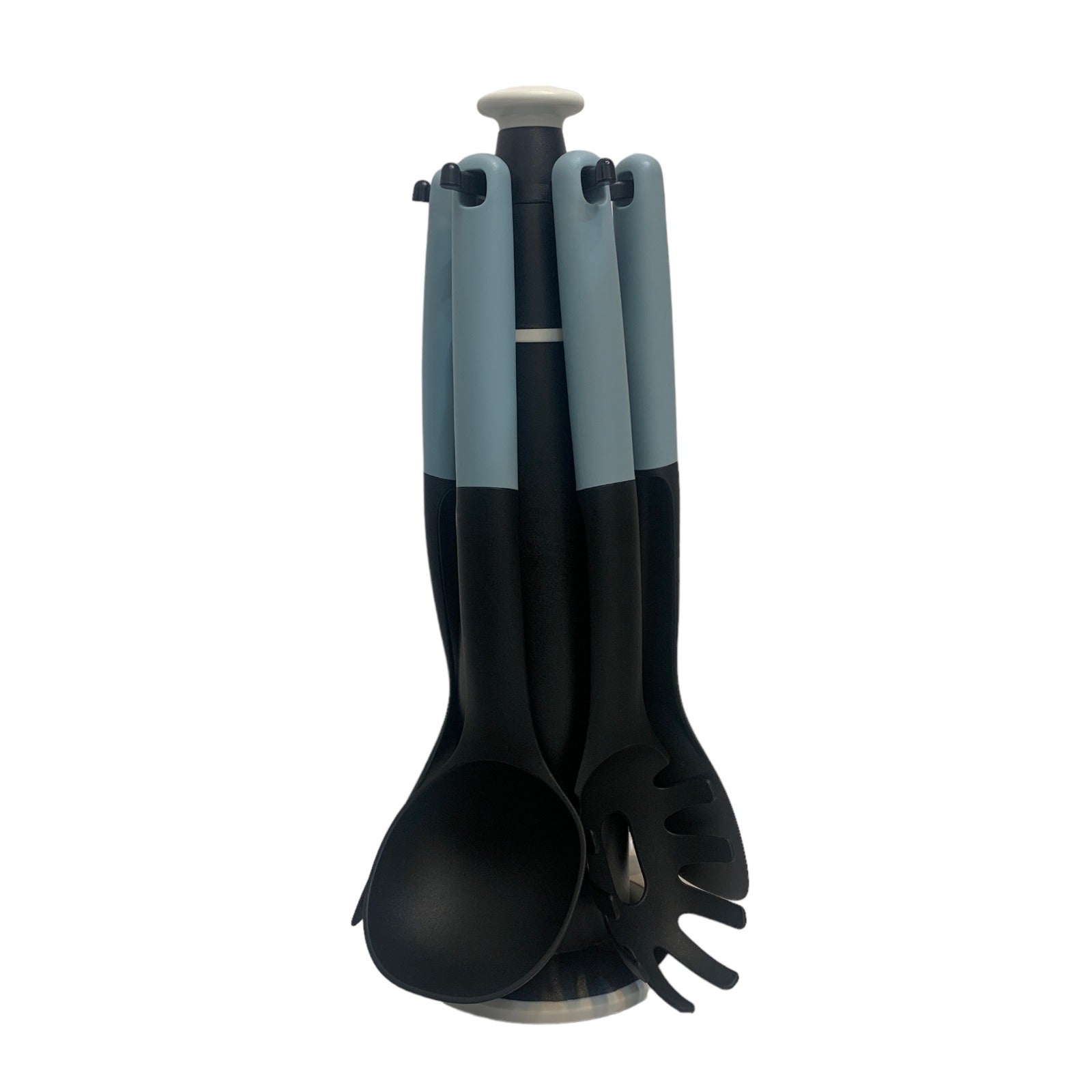 Juego de Utensilios Con Base Giratoria de Color Negro con Azul 7 piezas.