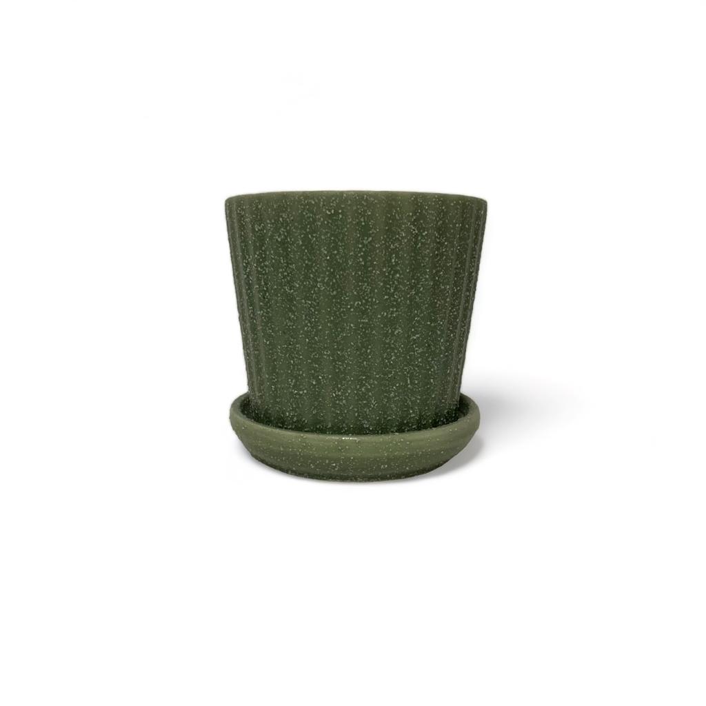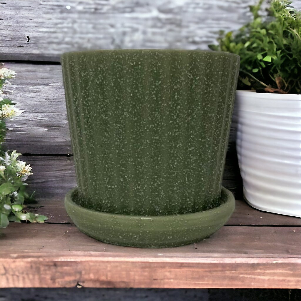 Maceta de cerámica con plato color verde granito 10 x 10 x 10. Compra de mayoreo y surte tu tienda o negocio, tenemos peluches, perfumes, ventiladores, maquillaje, accesorios, desechables, mochilas, blancos, papelería, juguetes y productos de temporada de mayoreo en demayoreo.com.