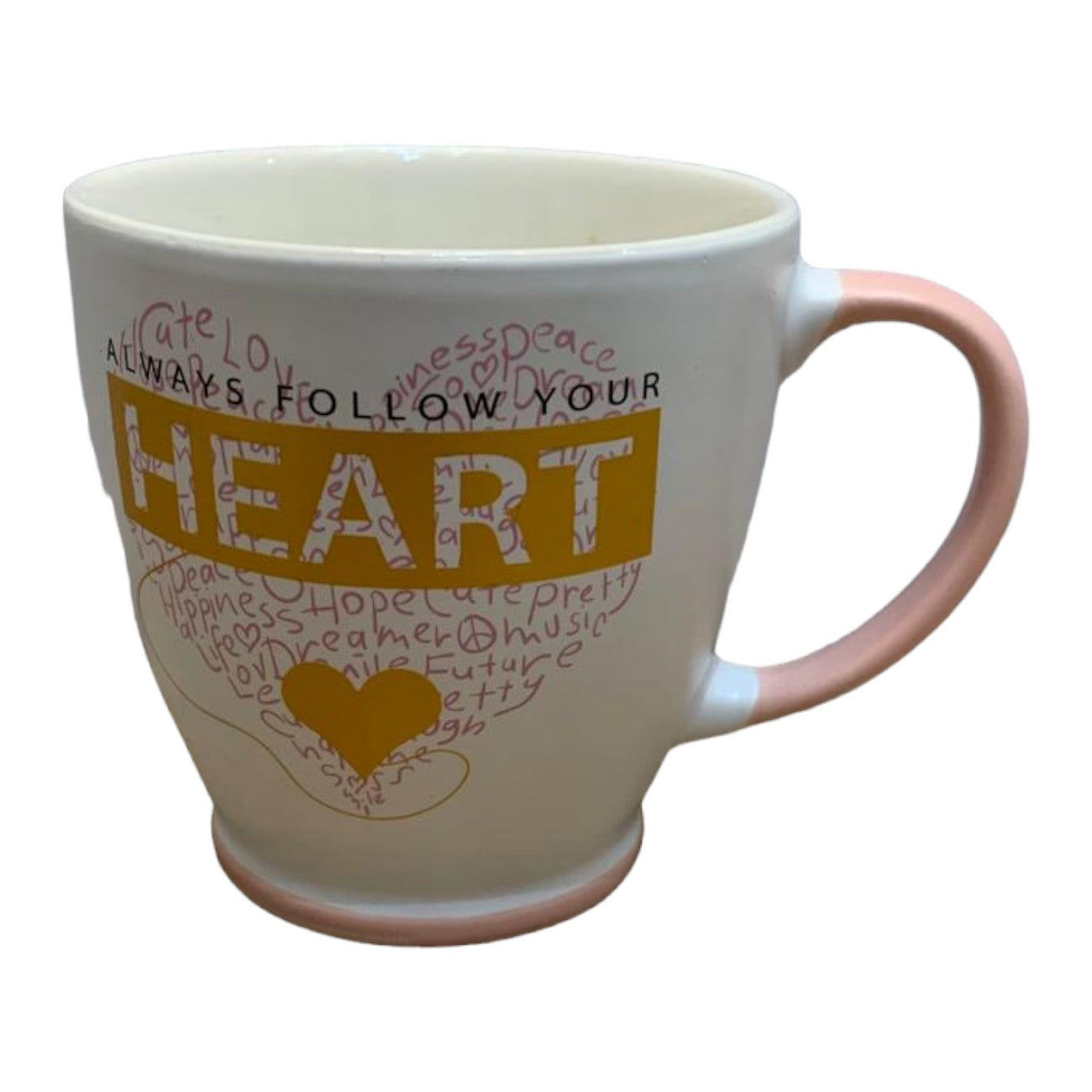 Taza de porcelana color blanco con rosa y letras amarillas, alwayas folow your herat, con capacidad de 380ml. Compra de mayoreo y surte tu tienda o negocio, tenemos peluches, perfumes, ventiladores, lenceria, ropa, maquillaje, accesorios, desechables, mochilas, blancos, papeleria, juguetes y productos de temporada de mayoreo en demayoreo.com