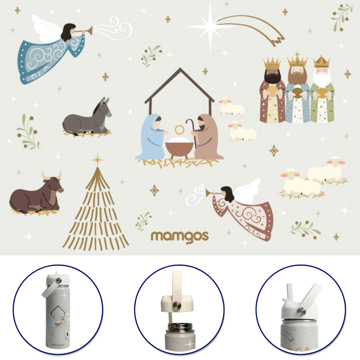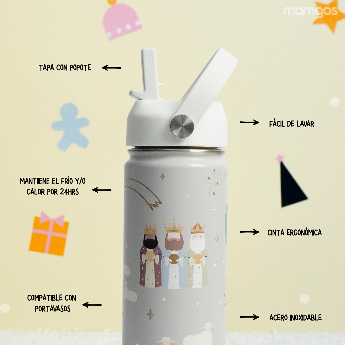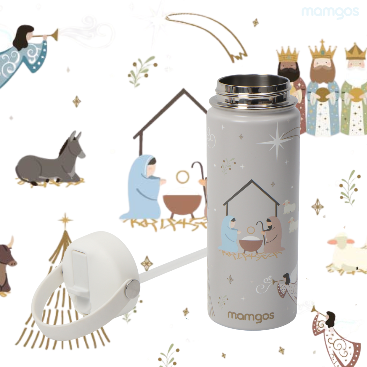 Termo Mamgos con ilustraciones del nacimiento de Jesús. Mantiene el frío y el calor por 12 horas, el interior es de acero inoxidable. Tiene capacidad de 530 ml. Compra de mayoreo y surte tu tienda o negocio, tenemos peluches, perfumes, ventiladores, maquillaje, accesorios, desechables, mochilas, blancos, papelería, juguetes y productos de temporada de mayoreo en demayoreo.com.