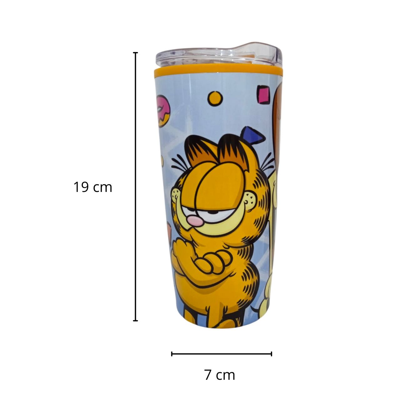 Termo Garfield y Odie de plástico en el interior y acero inoxidable en el exterior. Tiene capacidad de 500 ml, mantiene el frío por 4 horas y el calor por 1 hora.