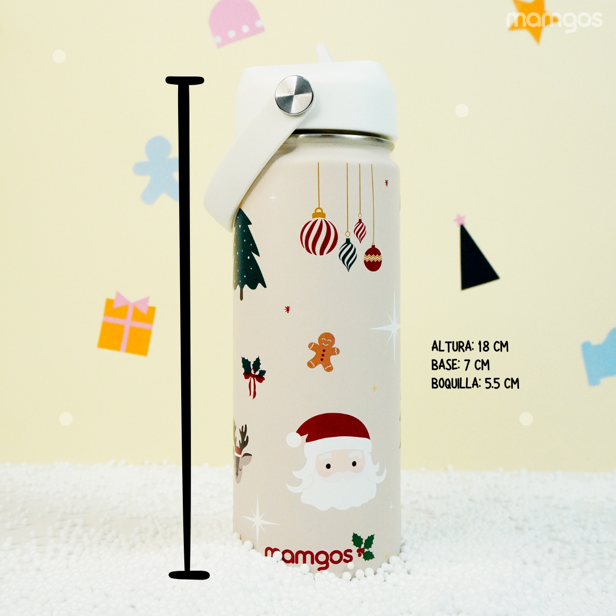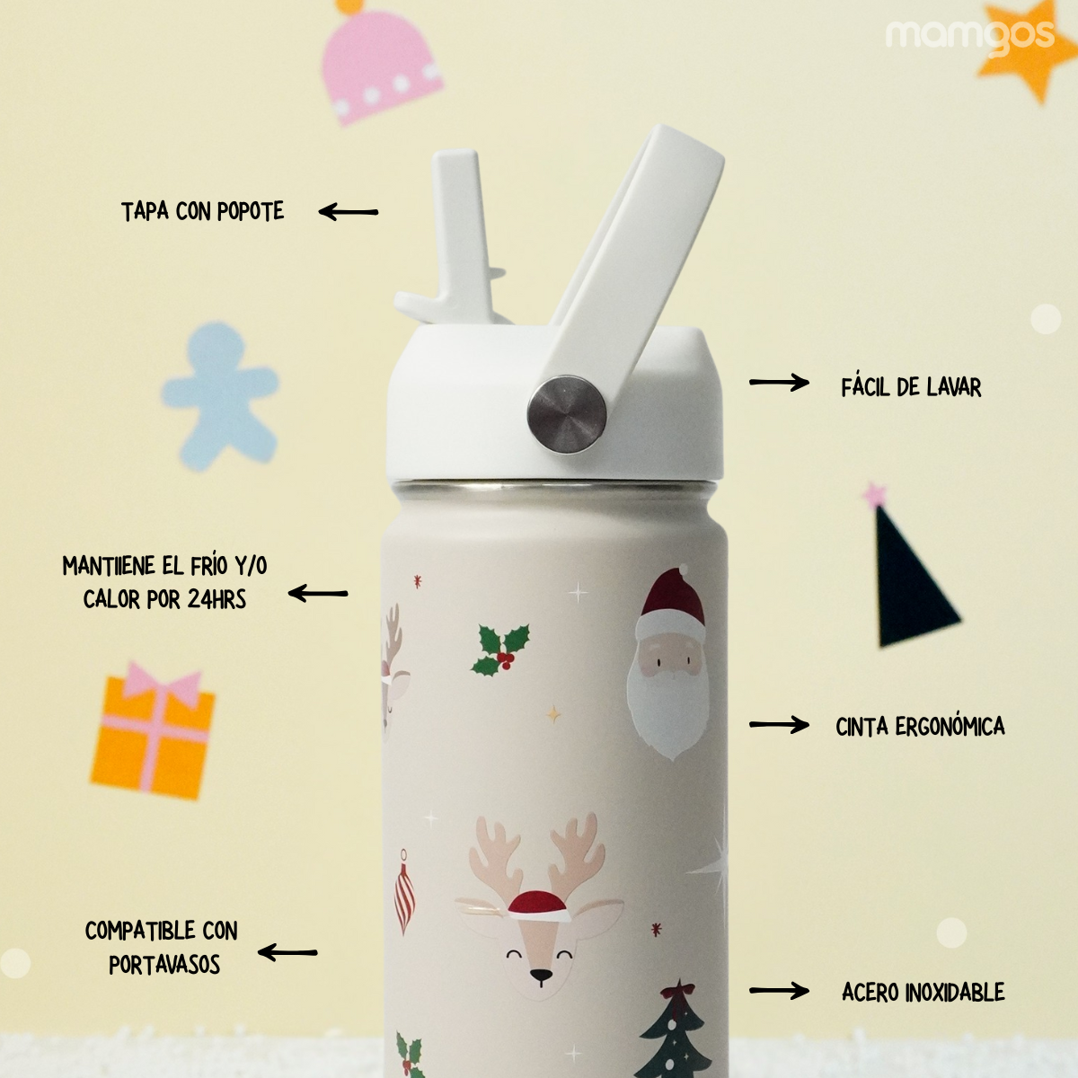 Termo Mamgos con ilustraciones de Santa Claus. Mantiene el frío y el calor por 12 horas. Su tapa incluye popote extraíble fácil de lavar y apto para lavavajillas. Tiene capacidad de 530 ml. Compra de mayoreo y surte tu tienda o negocio, tenemos peluches, perfumes, ventiladores, maquillaje, accesorios, desechables, mochilas, blancos, papelería, juguetes y productos de temporada de mayoreo en demayoreo.com.
